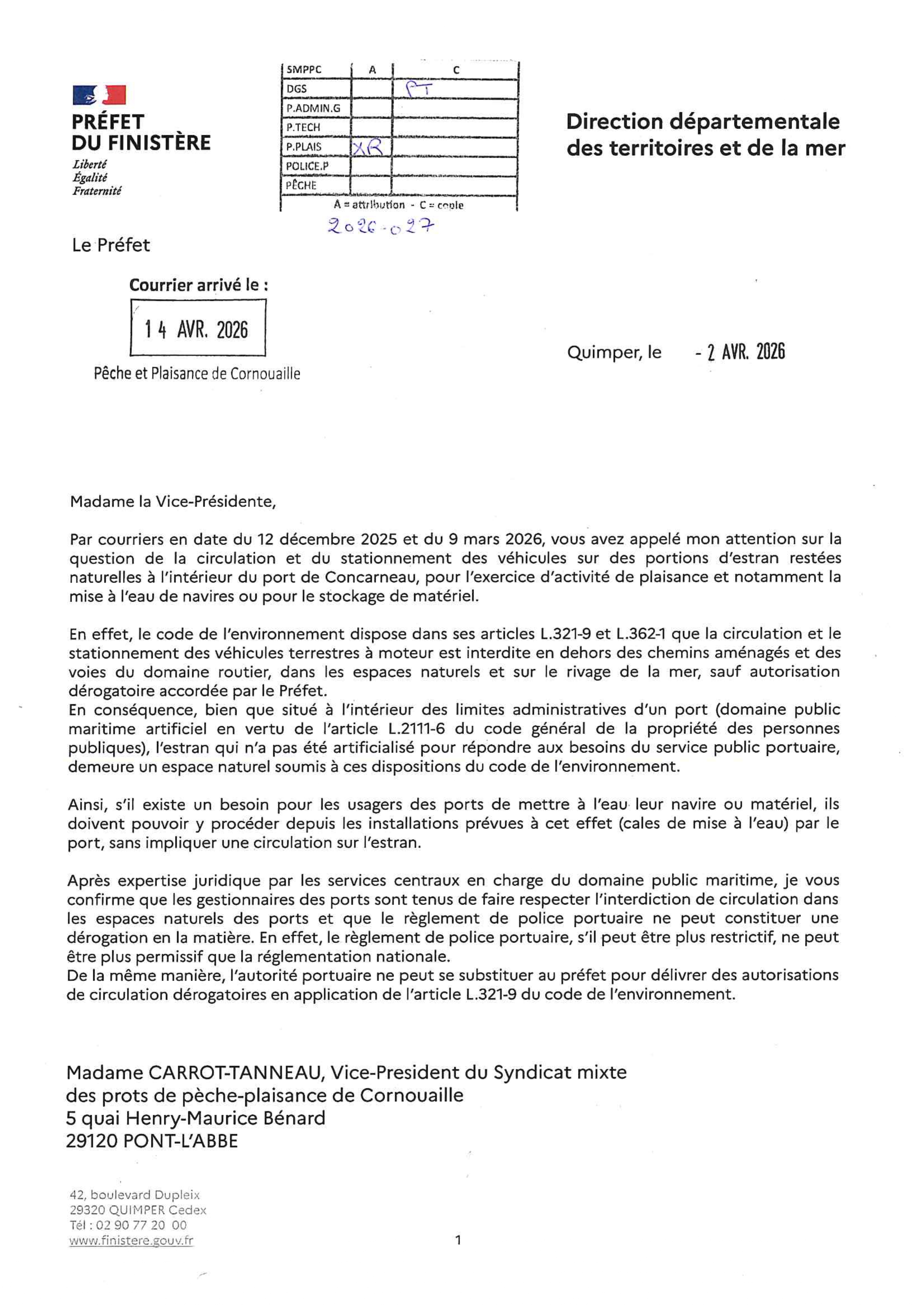 Nous vous transmettons ci-dessous le courrier de la Préfecture relatif à la circulation et au stationnement des véhicules terrestres à moteur sur l’estran naturel dans l’anse de Kersaux (Cabellou).
